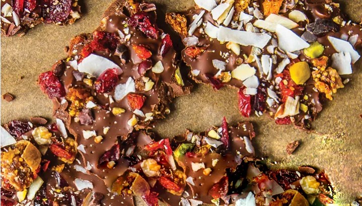 Blanda alla torra ingredienser i en bytta. Smält den mörka chokladen i vattenbad och låt den därefter svalna något. Lägg i hälften av frukt- & nötblandningen och blanda väl. Häll i en bakplåt med bakplåtpapper. Sprid chokladen jämnt över hela plåten (ca. 1 cm tjockt). Strö över återstående torra ingredienser. Placera i kylen tills chokladen stelnar. Bryt upp i lagom stora bitar och njut!